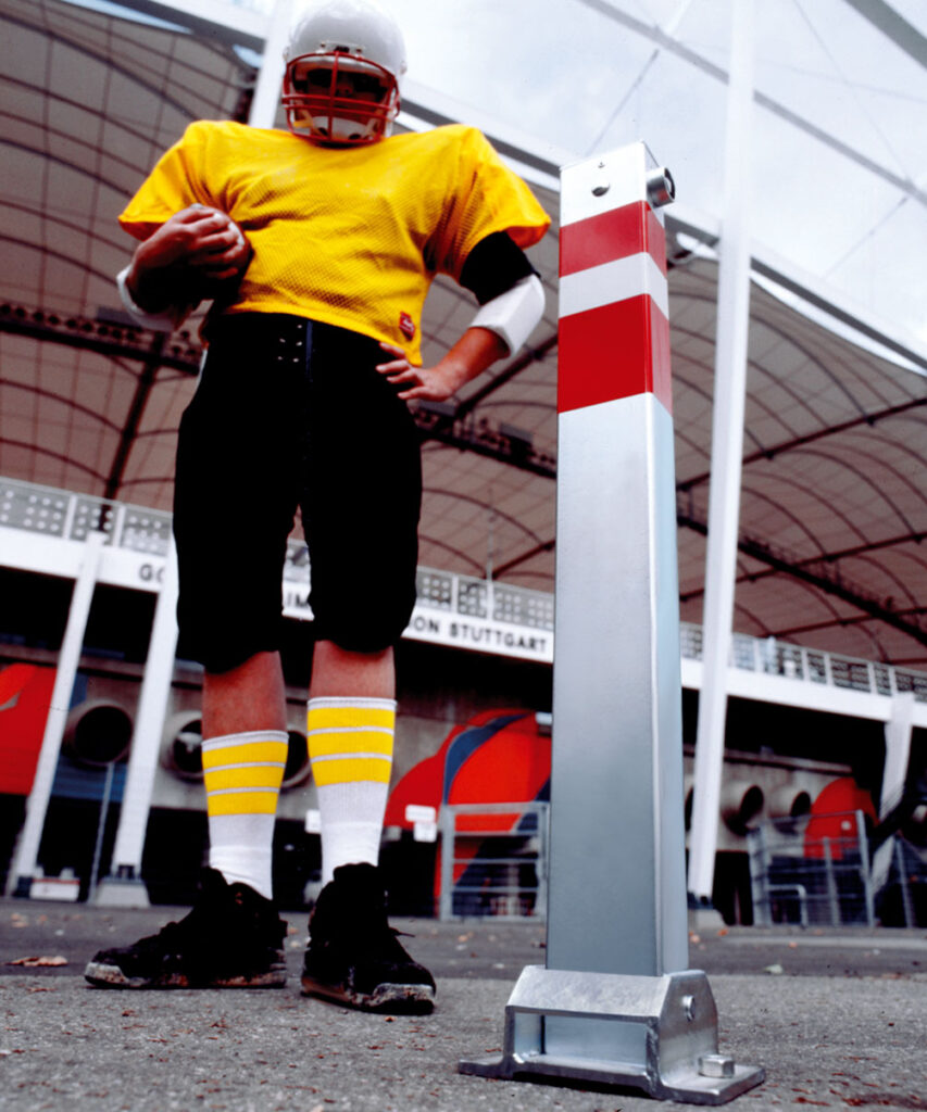 - Um Parkplätze zu gestalten, die nur bestimmten Personenkreisen vorbehalten sind, können Absperrpoller eingesetzt werden. Diese sollten heraus- oder umlegbar sein und sich mit einem Sicherheitsschloss verriegeln lassen.