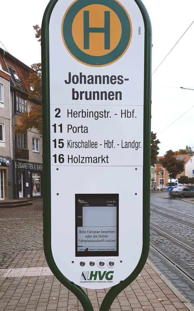Das Fußschild präsentiert das Logo des Verkehrsbetriebes wie eine Visitenkarte.