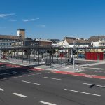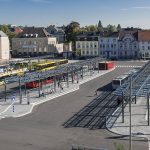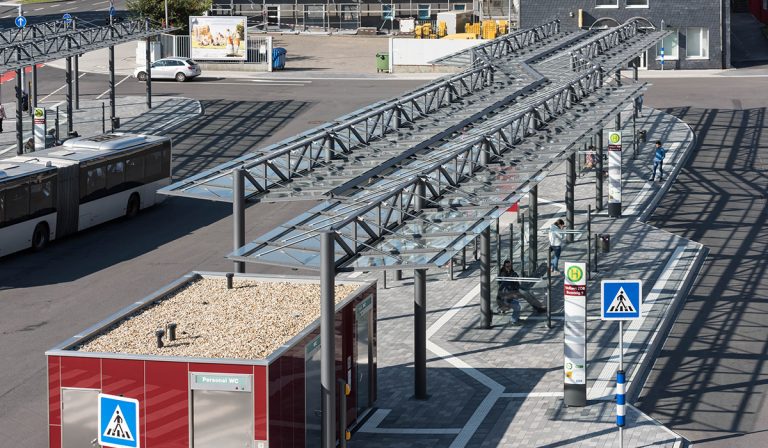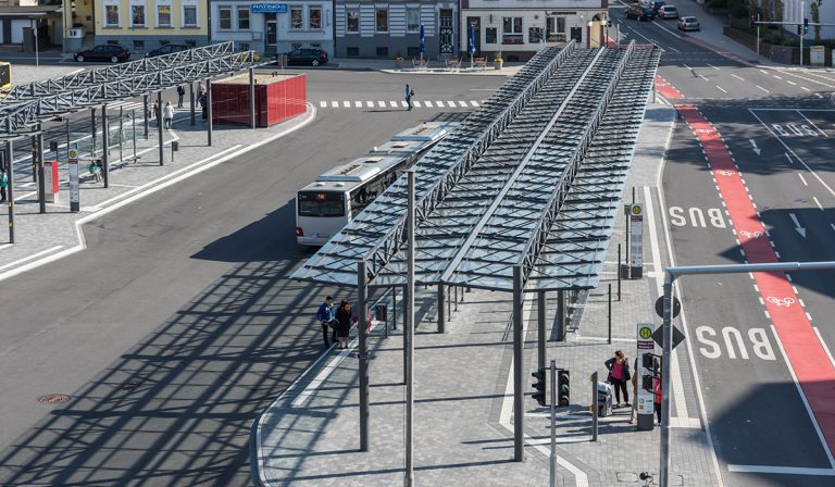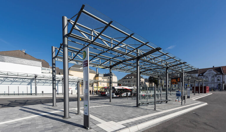 Die mittlere Überdachung mit der an den Bussteig angepassten Dachkontur stellte besondere Anforderungen an das Überdachungs-System, das sich nun harmonisch in das Gesamtbild einfügt.