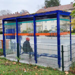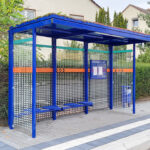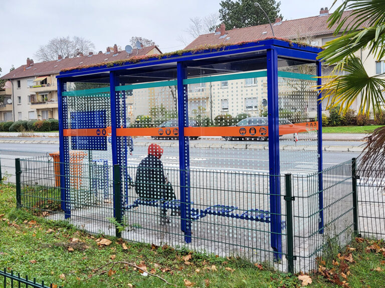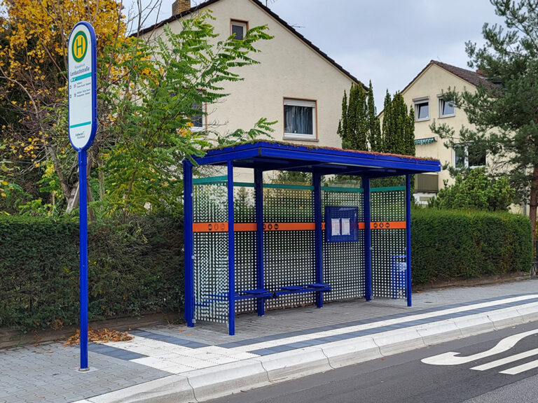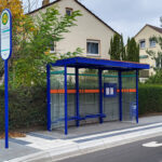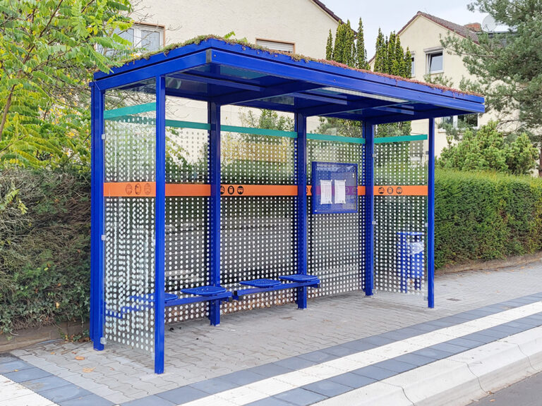 Die Wartehallen der MABEG Baureihe A-G im RMV Farbton RAL 5002 ultramarinblau erhalten das typische RMV Scheibendekor im keramischem Siebdruck, die Dacheindeckung mit Gründachkassetten, Beleuchtung mit LED Spots, Informationsvitrinen und Sitzbänken.