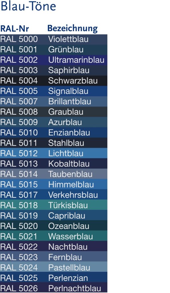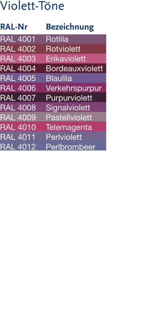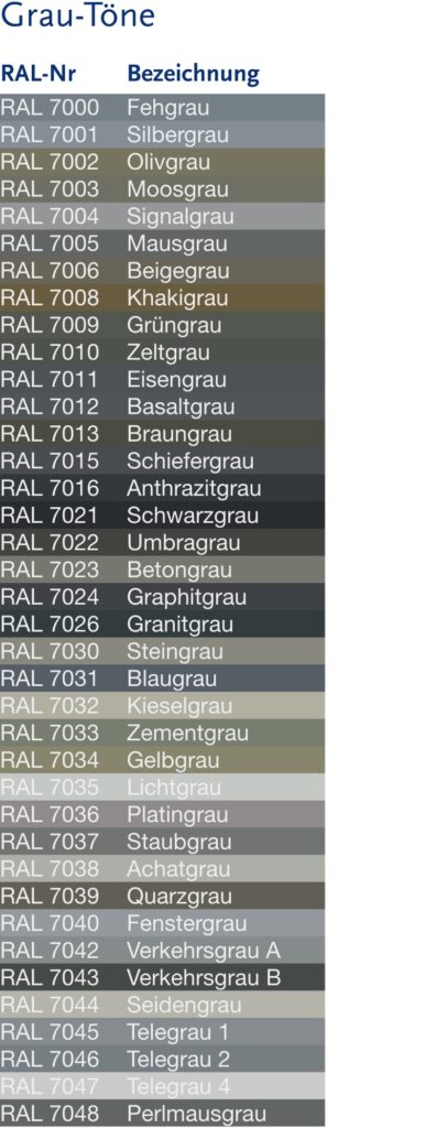 Die nachfolgende tabellarische Auflistung der RAL classic Farben soll Ihnen einen ersten Anhaltspunkt für Ihre Farbwahl geben. Nicht alle Farbtöne sind serienmäßig aufpreisfrei lieferbar. Bitte fragen Sie uns im Einzelfall.
